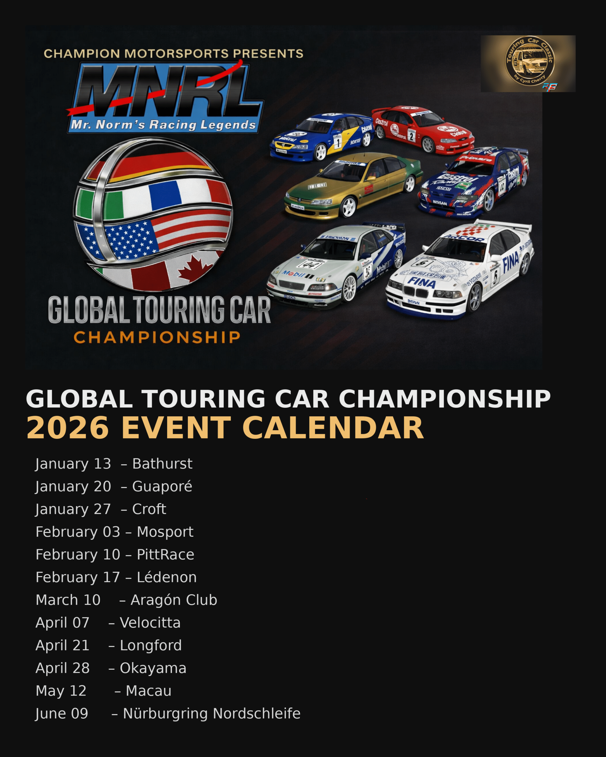 MNRL will run a 12-race calendar with tracks that bring life to the creation of a GLOBAL TOURING CAR CHAMPIONSHIP that takes us racing around the world and writing our own Sim Sport history. All rounds will feature 2 sprint race with the second grid reversed from race 1 results.